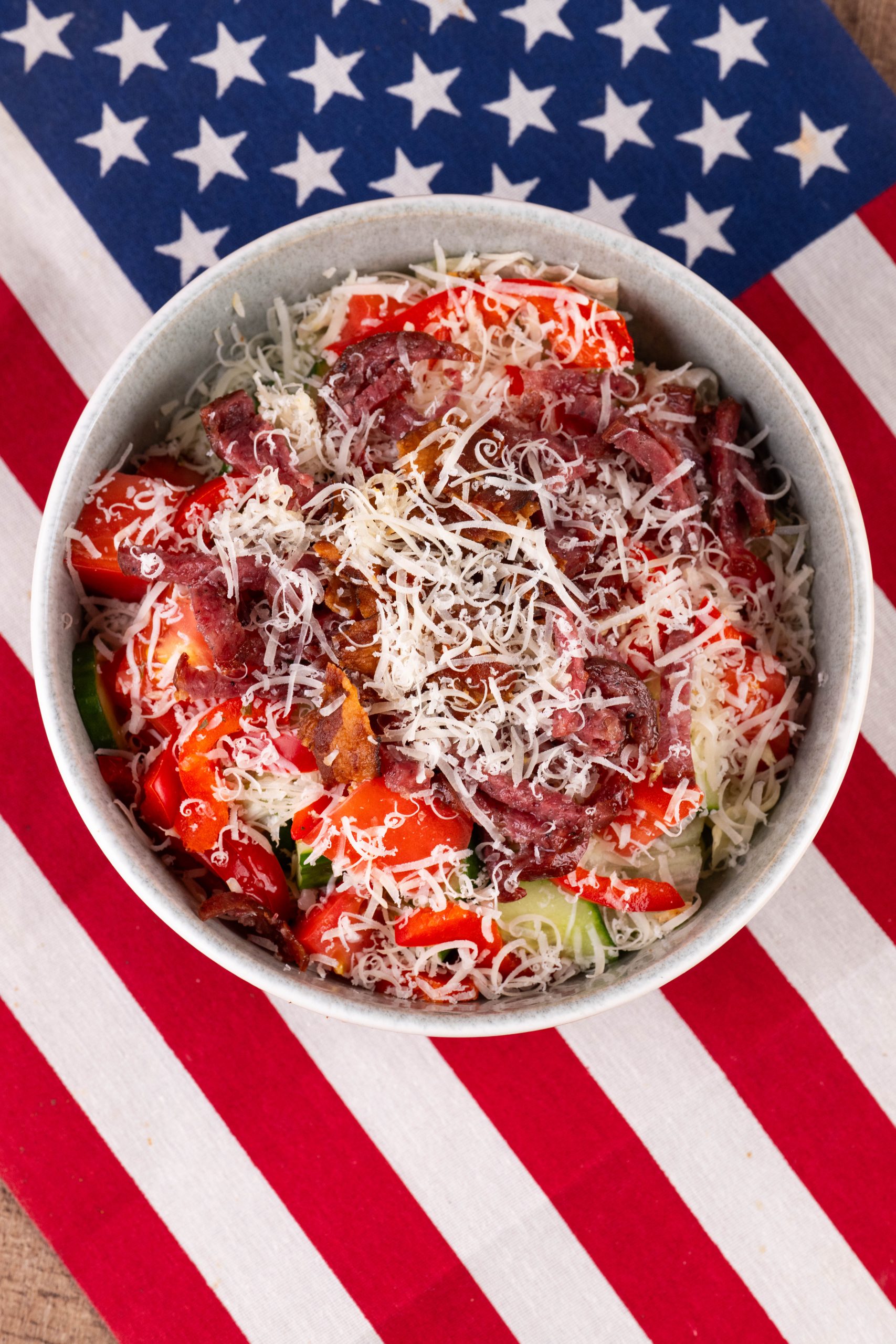 Айсберг, помидоры, огурцы, бекон, салями, ветчина, перец, сыр пармезан, сыр чеддер, итальянская заправка